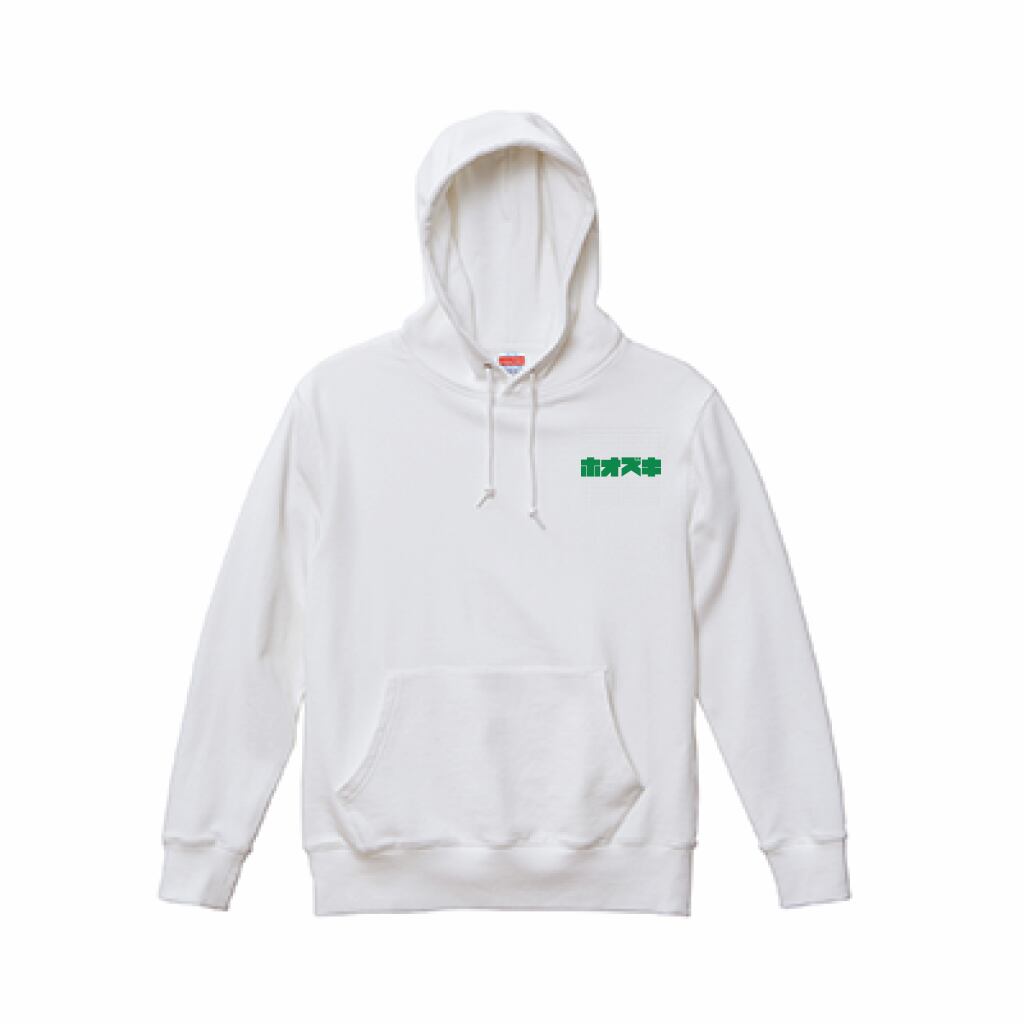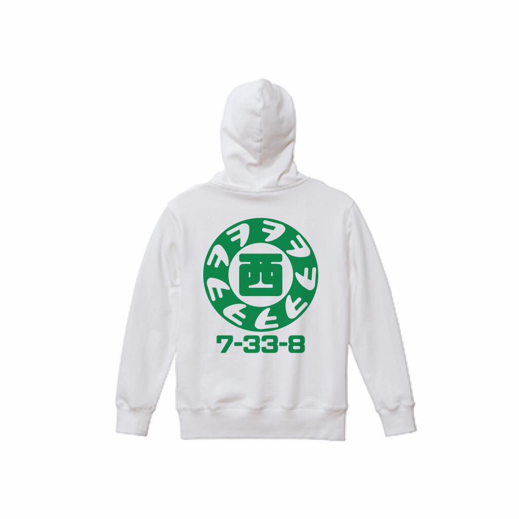 ホワイト&ピュアグリーン ホオズキパーカー 左胸ロゴ 背面西尾久
